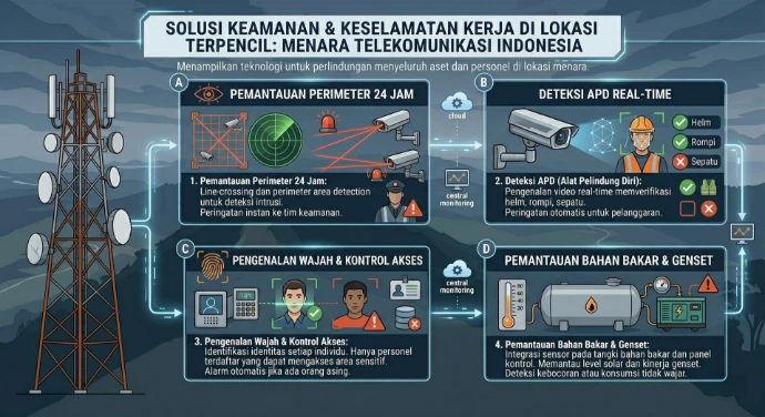 Aset tersebar diseluruh pulau dengan nilai yang sangat mahal, sulit dimonitoring hingga menyebabkan pencurian dan kehilangan aset lainnya. dengan cctv existing anda bisa memantau siapa yang masuk ke area site, alarm intrusi untuk pencuri barang dan integrasi sistem IOT untuk mendeteksi penggunaan solar.
